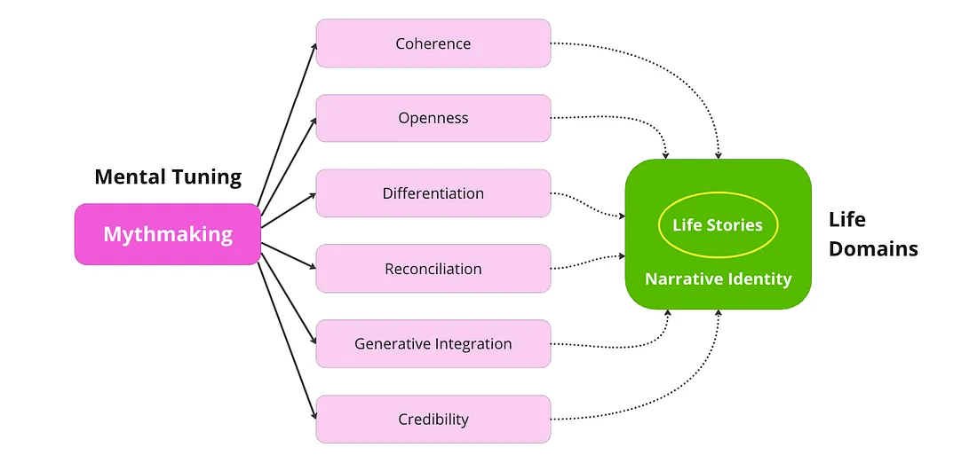 McAdams developed an explicit developmental framework for personal mythmaking. Several significant elements impact personal mythmaking, each linked to a particular developmental period (1993, pp.270–271).