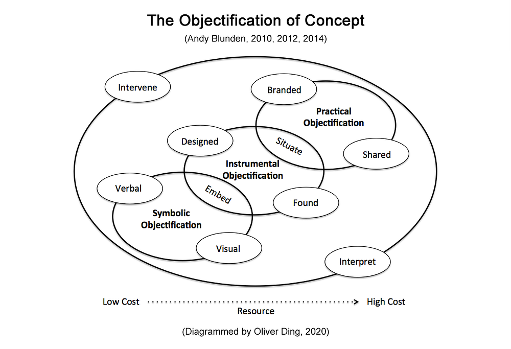 Blunden clearly claims that there are three aspects of objectification of concept: symbolic, instrumental, and practical. By adopting the germ-cell diagram, we can present these ideas with the diagram below.