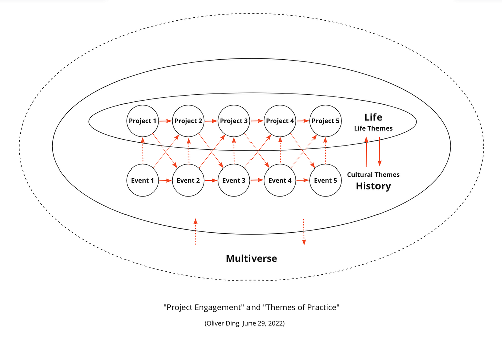 This part documents the early development of the Project Engagement approach from January to July 2022. Key developments include the Life-as-Project approach with its seven principles, the introduction of the “Events — Projects” distinction, and the conceptualization of life as moving between thematic spaces.