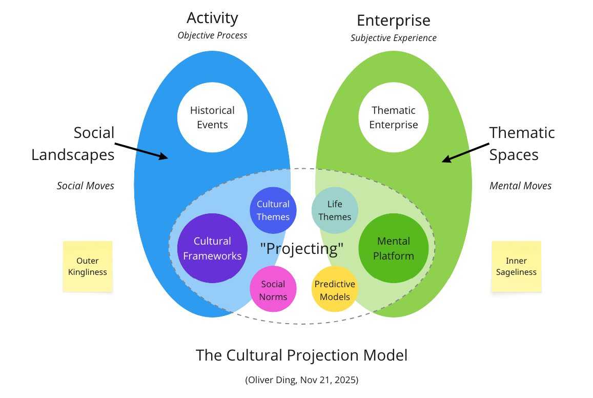 Moreover, the Cultural Project Model offers a set of operational concepts that together form a research framework capable of supporting this creative dialogue. Concepts such as Mental Platform, Predictive Models, Life Themes, Thematic Spaces, Mental Moves, Thematic Enterprise, and Subjective Experience belong primarily to the domain of “inner sageliness,” emphasizing the cultivation of mind, meaning-making, and internal organization. In contrast, concepts such as Cultural Frameworks, Social Norms, Cultural Themes, Social Landscapes, Social Moves, Historical Events, and Objective Processes correspond to the domain of “outer kingliness,” focusing on cultural structures, social action, and historical development — much as Confucianism has historically functioned in East Asia.