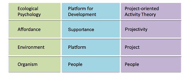 Both three concepts share the same deep structure: the Reciprocal Relationship between Environment and Organism. For the Platform-for-Development framework, we can consider Platform as Environment. For Project-oriented Activity Theory, we can consider Project as Environment.