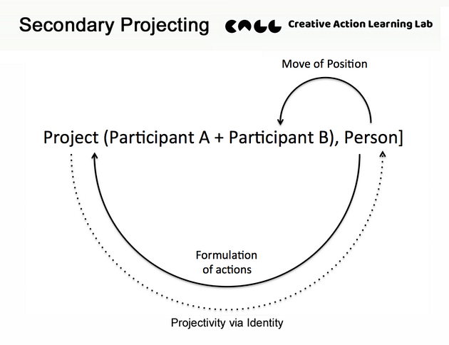The above diagram shows an abstract model of secondary projecting with two people and one project. Participant A is the first person who initiates the project while Participant B is the second person who recognizes Secondary Projectivity and participates in the project.