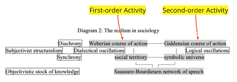 I roughly consider First-order Activity echoes the Weberian course of action while Second-order Activity echoes the Giddensian course of action.