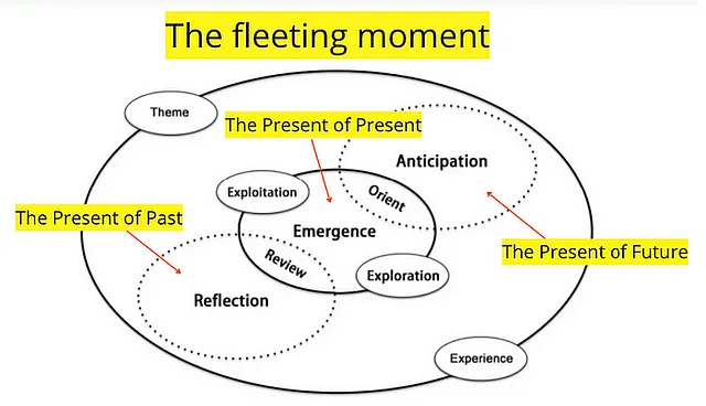 According to Lui, “This moment is Augustinian, it comprises at the same time the Present of the Past, the Present of the Present, and the Present of the Future. The actor Remembers in the present of the past, Pays Attention in the present of the present, Expects in the present of the future.” (p.235–236, 2010, The Scientific Project of Sociology)