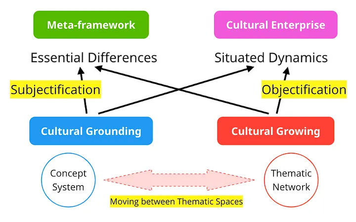 This model also highlights the Meta-framework and Cultural Enterprise. The former refers to the Essential Differences of a Thematic Enterprise, while the latter refers to the Situated Dynamics.