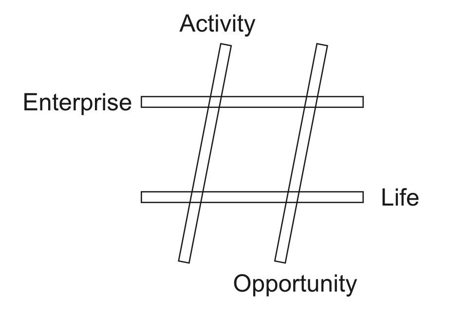 The Weave-the-Life Framework weaves together four dimensions: Activity, Enterprise, Life, and Opportunity. Activity refers to individual engagement in projects. Enterprise represents the crystallization of collaborative action—it develops its own logic and trajectory beyond individual intentions. Life (in the narrow sense) refers to individual life course. Opportunity serves as the channel through which social structures and historical events enter individual experience. These four dimensions are continuously interwoven in lived experience, creating the fabric of both individual biography and social reality.
