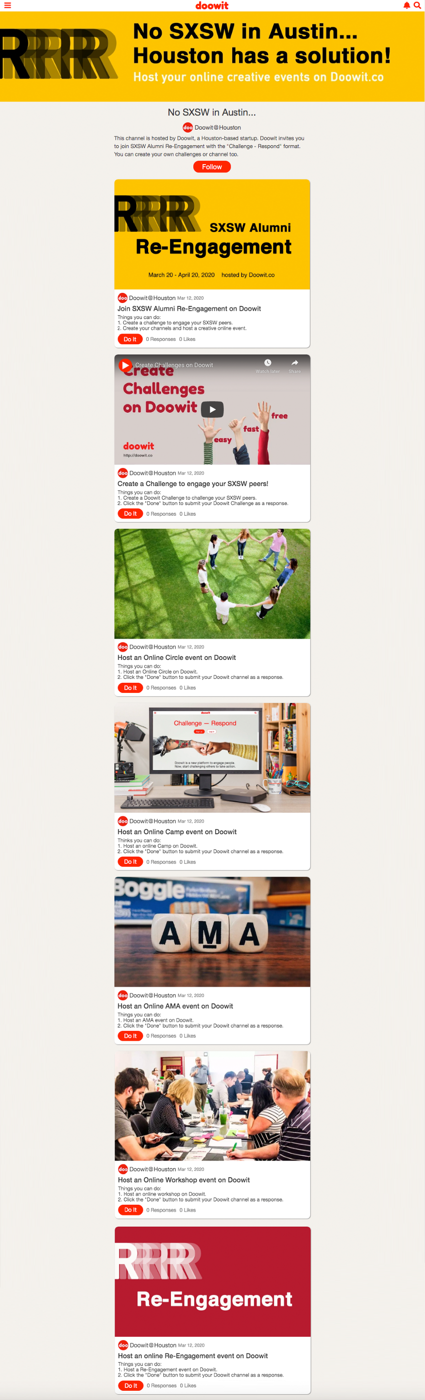 I also applied these ideas to the SXSW case and designed a mini website as a demo of the concept. Since I was a member of the team of Doowit which is a new platform for curating challenge-based activities, I used the Doowit platform to build a Doowit channel to represent my ideas. The screenshot below is the homepage of the channel.