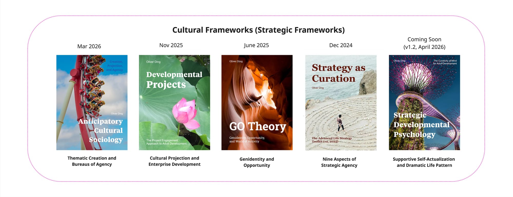 The books in this layer — GO Theory (June 2025), Strategy as Curation (Dec 2024), Developmental Projects (Nov 2025), Anticipatory Cultural Sociology (Mar 2026), and Strategic Developmental Psychology (Coming Soon, v1.2) — map this dual terrain.