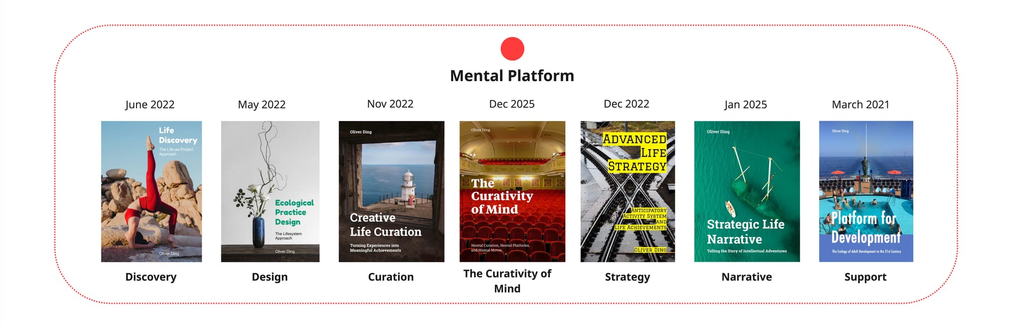 The seven books in this layer — Life Discovery, Ecological Practice Design, Creative Life Curation, The Curativity of Mind, Advanced Life Strategy, Strategic Life Narrative, Platform for Development — each addressed one key function of the creative enterprise: