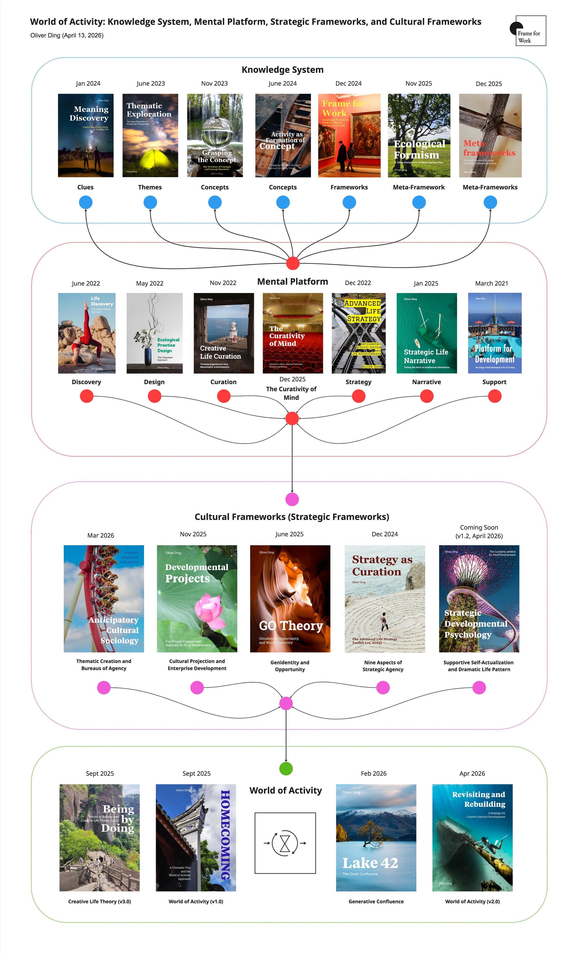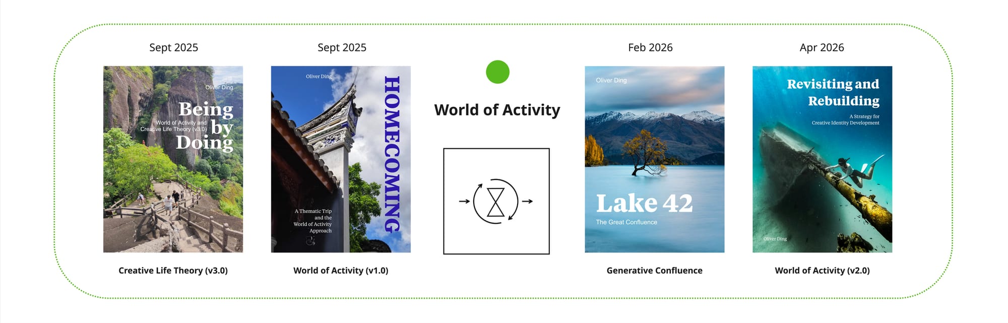 The books in this layer have each made distinct contributions to the FFCC model. Homecoming was the empirical research project built around the FFCC Schema — analyzing the author's own autobiography and 2025 journey to Fuzhou, identifying seven specific forms of the World of Activity, and using the FFCC model to explain the dynamics and differences between them. Lake 42 developed this further, articulating eight movements using FFCC terminology and integrating the Living Coordinate concept with the FFCC model into a unified framework. The recent Revisiting and Rebuilding practice — particularly the Significant Themes case study — made a further contribution: several new FFCC model cases emerged, and insights from Homecoming, Lake 42, the Knowledge Discovery Canvas, and other projects were integrated into a multi-layered structure centered on the FFCC model.
