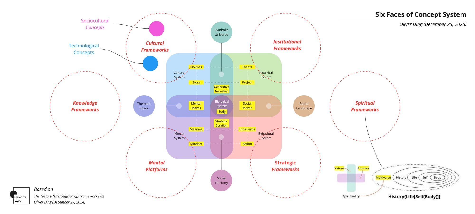 Then, on December 20, 2025, I formally started the Meta-frameworks project. I wrote three foundational articles — the History{Life[Self(Body)]} Framework (v3.0), the Six Faces of the Concept System, and Weave the Culture — and curated a series of related knowledge models into a comprehensive Weave-the-Culture toolkit.