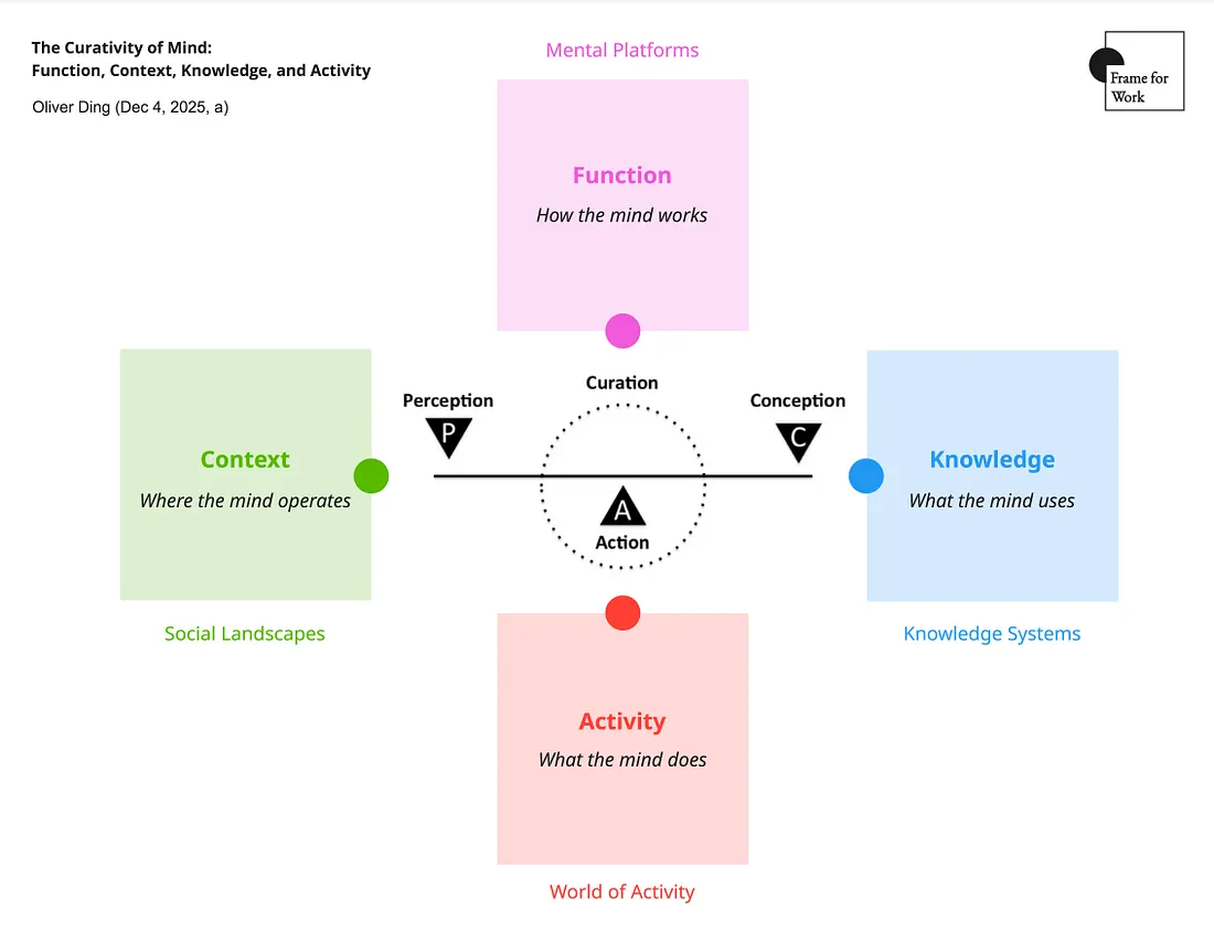 At the core of this framework is the "Perception — Action — Conception — Curation" schema. Curation is proposed as a fourth foundation alongside the three traditional keywords of mind: not merely passive (perception), active (action), or representational (conception), but fundamentally curatorial — constantly selecting, organizing, and synthesizing experiences, concepts, and actions into coherent wholes.