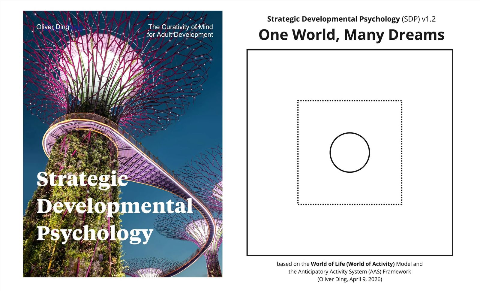 Strategic Developmental Psychology attends to the individual scale — how a person builds the mental platforms and strategic frameworks needed to develop a creative enterprise across time. SDP's three dimensions correspond to three versions of development: the Curativity of Mind (v1.0), the five developmental orientations of Learn–Discover–Design–Deliver–Weave (v1.1), and Supportive Life Discovery together with Dramatic Life Pattern (v1.2).