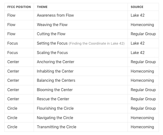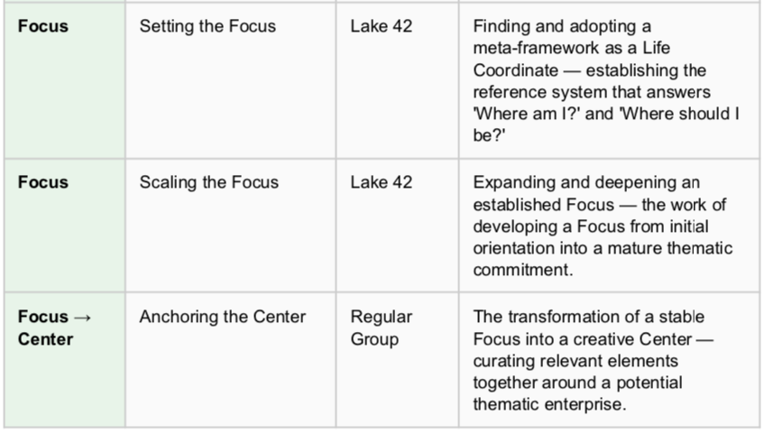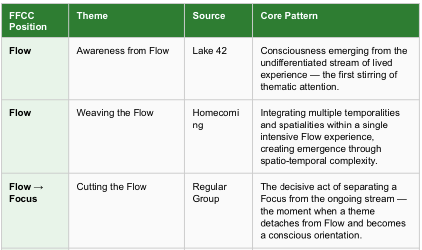 Through the RR operations of March 2026, the Quasi-invariant layer was expanded significantly by integrating insights from Lake 42 and Homecoming. The complete Quasi-invariant layer now contains thirteen themes across all four FFCC positions. The three sources are not additive by accident. The Regular Group provides the core career and professional developmental arc. Lake 42 provides fine-grained differentiation at the Flow and Focus stages. Homecoming provides ecological diversity of Center and Circle configurations. Together, they map the full developmental terrain of a creative life organized around the FFCC model.