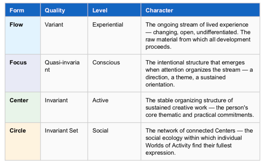 The FFCC Schema organizes the World of Activity around four basic ecological forms: Flow (the stream of experience moving through a life), Focus (the thematic concentration that gives direction to the flow), Center (the organizing core around which creative activity stabilizes), and Circle (the social relational network within which the center operates and extends). These four ecological forms are not sequential stages but simultaneously active aspects of any creative life — each shaping the others, each visible from a different angle.