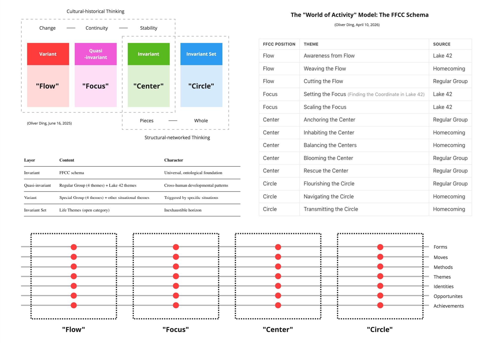 The FFCC schema became not only a map of thematic spaces but a framework for understanding how identity itself evolves as a person moves through Flow, Focus, Center, and Circle across time.