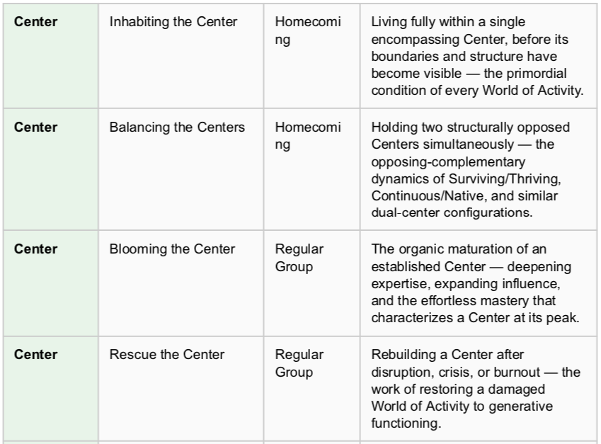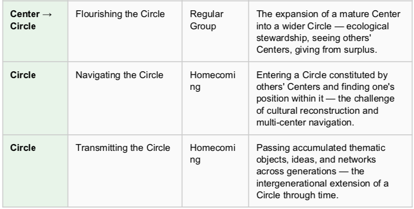 The three source works contribute to different regions of the map. The Regular Group of Significant Themes framework captures the core career and life development arc (Cutting the Flow through Flourishing the Circle). Lake 42 articulates the fine-grained operations of Flow and Focus (Awareness, Setting, Scaling). Homecoming extends the map into the ecological diversity of Center and Circle life — the primordial, the dual, the navigated, the transmitted. Together, they constitute the first systematic charting of the Quasi-invariant layer of the World of Activity.