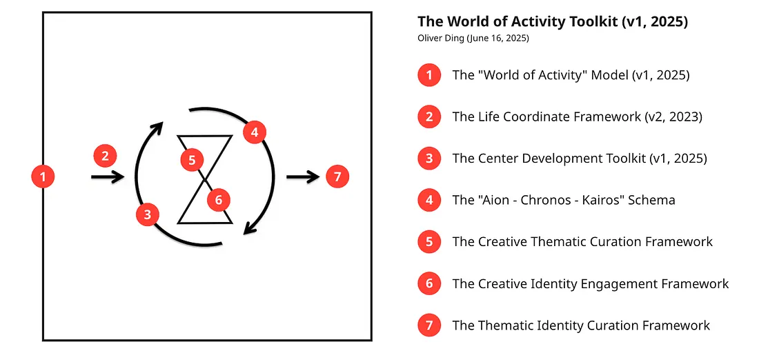 Following this direction, I created the World of Activity Toolkit (v1.0, 2025) on June 16, curating several newly developed knowledge frameworks into a unified structure. (See diagram below.) More details are available in GO Theory: Chronos Space, Aion Space, and World of Activity.