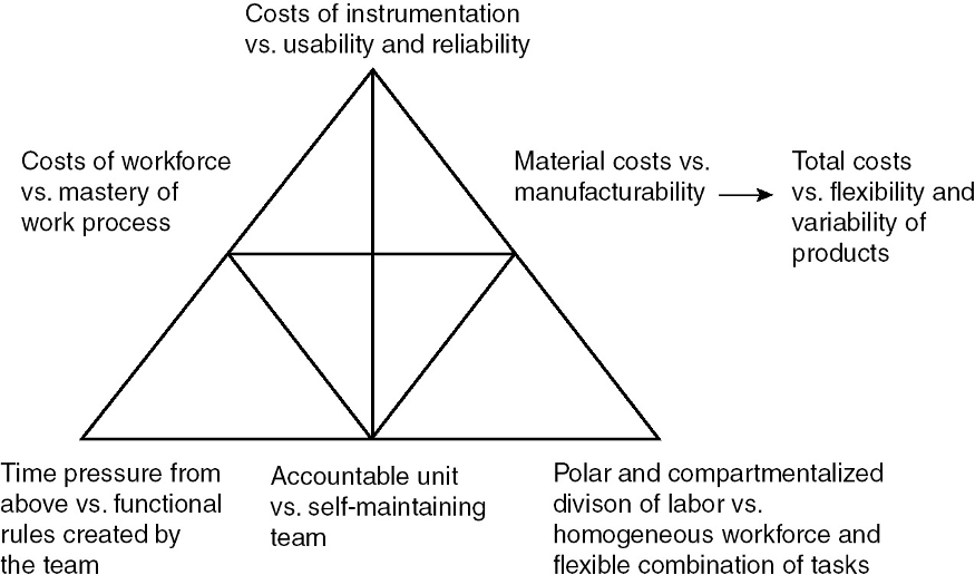 The diagram below is for discussing the primary contradiction of modern work activity. Now, the graphic models became a tool for theoretical development. Engeström pointed out, “In terms of activity theory, we may say that there is on the one hand the object-activity (appearing in the form of market demands) requiring high quality, flexibility, variability and short delivery times from the products, which in turn require complex programmable cybernated instruments. However, there is an acute conflict between these factors and the striving for immediate cost-efficiency, manifested above all in the polar and compartmentalized division of labor. In effect, industrial capitalism has split the work activity in two basic layers of actions, those of operating or performing and those of design and management.”